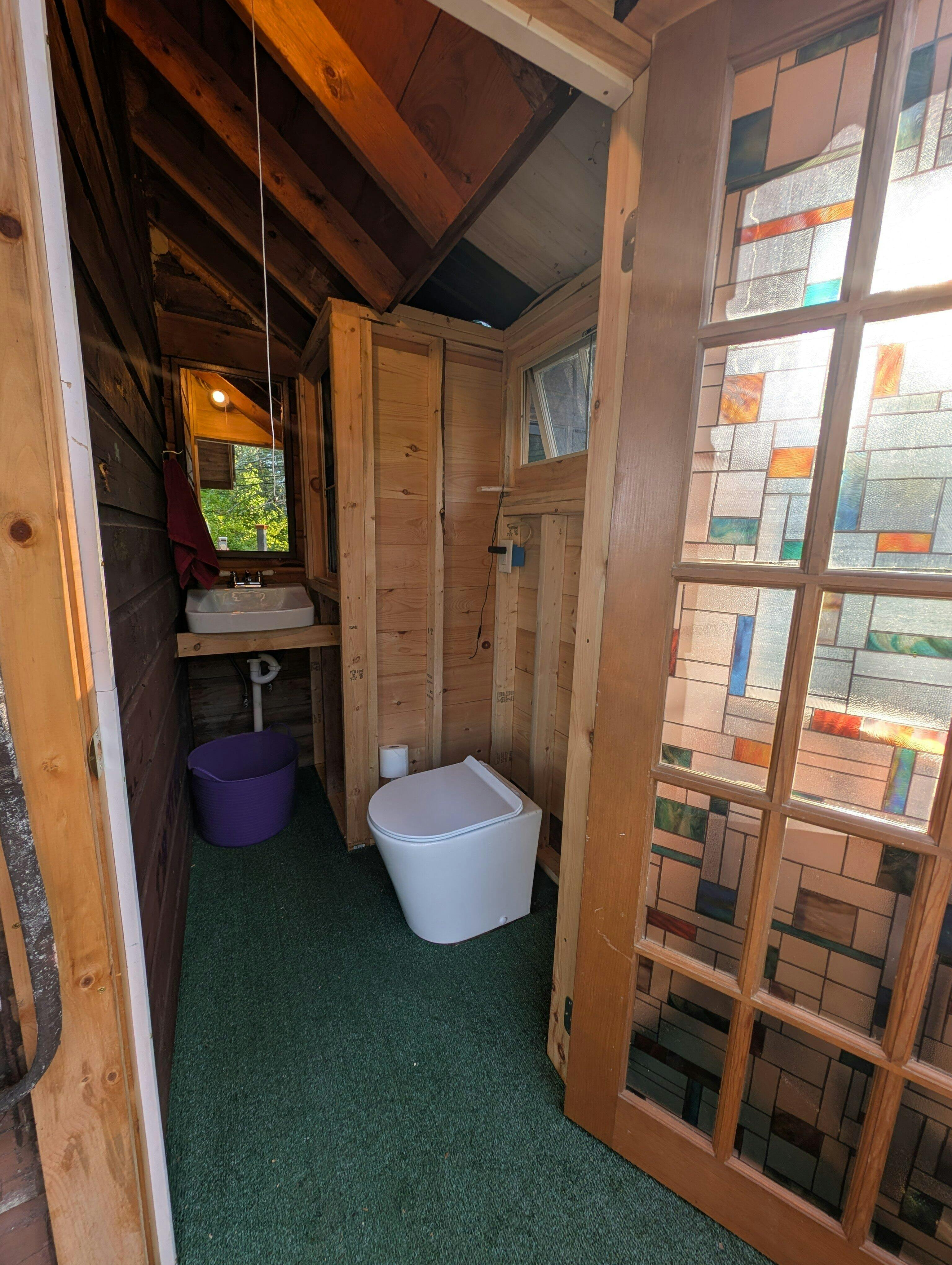 We have been building a small, off grid hut/cabin on our Utah mountain property. We were looking to build something small, simple and low maintenance. Our power is all 12 volt solar and we carry in water. This cabin will be seasonal (no septic)so the toilet had to be simple too. Other composting toilets have too many moving parts and a low capacity. After much research we decided on the GreenLoo GL90. I love the low profile composting bins. We decided to build an attached mechanical room/outhouse/shower room and built it to suit the toilet specifically. The GL90 porcelain toilet is tall and easy to keep clean. I ordered the 12v vent fan with my kit and it works perfectly NO smell at all! I turn off the solar when we leave so I was concerned it would smell upon our returns. So far so good! We are going to install a βwhirlybirdβ wind activated vent cap to vent in addition to the electric fan while we are away from the cabin. Install of the GL90 was a breeze and it looks great! Big thanks to the good folks at The Waterless Toilet Shop for their friendly support and expertise.. and a full line of supplies and accessories! Iβm adding some photos of the Toilet and build so far!
